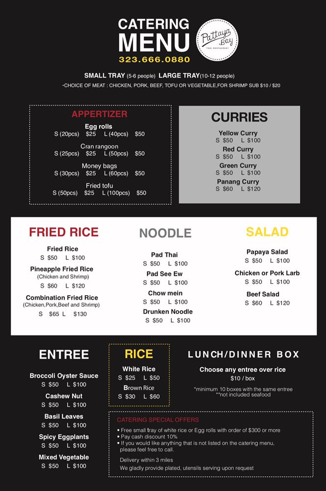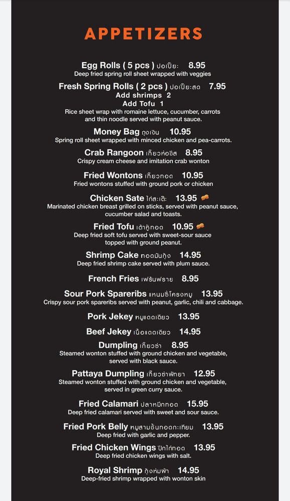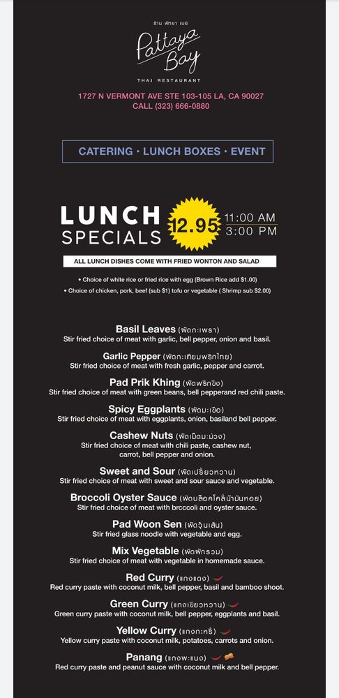 Pattaya Bay Thai, located in Los Angeles, offers a diverse menu of authentic Thai cuisine. The restaurant provides various appetizers like Banana Rolls and Chicken Sate, along with flavorful salads such as Crispy Catfish Salad and Fresh Shrimp with Spicy Lime Sauce. The soups at Pattaya Bay Thai boast rich flavors, including Coconut Soup and Spicy Seafood Soup. This restaurant also caters to various dietary preferences with vegan and vegetarian options. With amenities like outdoor seating, free Wi-Fi, and friendly service, Pattaya Bay Thai ensures a delightful dining experience for all. Don't miss out on the opportunity to savor these delectable Thai dishes at this Asian-owned gem in the heart of Los Angeles.